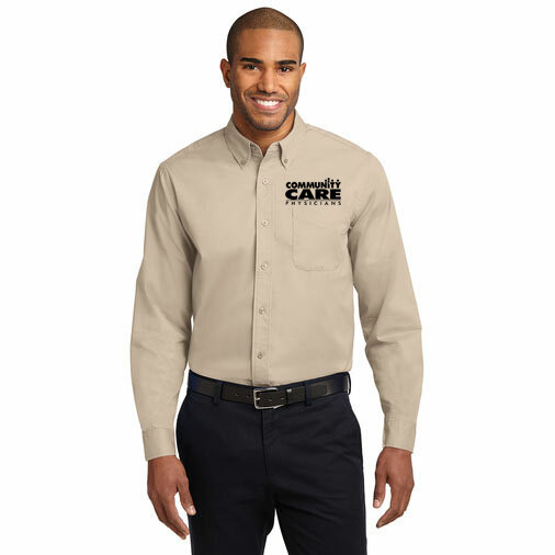 4.5-ounce, 55/45 cotton/poly. Button-down collar. Dyed-to-match buttons. Left chest pocket. Box back pleat. Adjustable cuffs. White, Athletic Gold, Texas Orange, Red, Burgundy, Coffee Bean, Light Blue, Navy, Classic Navy, Steel Grey, Purple and Black have a Light Stone contrast neckband. Light Stone and Royal have a Classic Navy contrast neckband. Dark Green has a Navy contrast neckband.